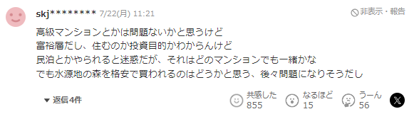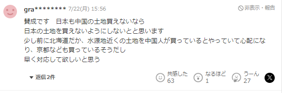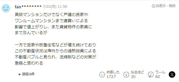 不仅仅是高级公寓、一户建的民居和一居室都被爆买,结果导致整个房地产价格上涨、蔓延到租金也上涨。另一方面空屋和废弃房屋的数量又在不断增加。这种状况就是由于海外投资过热造成的,被视为房产泡沫,当务之急需要出台相关的法规政策应对才行。我认为高级公寓是没有问题的,但是富裕阶层,不知道是否自住或者投资目的,如果他们作为出租民宿的话会很麻烦,但我想这对所有公寓都一样的。除此之外,我认为能便宜买到水源地的森林这以后也会成为大问题。我同意这个观点。毕竟如果日本人不能购买中国的土地。那我认为中国人也不应该能购买日本的土地。前段时间,我听说中国人在北海道水源附近买地,听说他们还在京都等地买地,我很担心。我希望政府能尽快对应解决这个问题。对于中国人在日本的各种爆买房产和土地,看得出来,日本人的危机感十足。随着这几天日元的小幅回升,这股在日本的购房大潮是否即将迎来尾声,我们不得而知。不过可以确定的是,日本房产的购买通道在未来可能只会不断收紧,如何在这波时代红利面前分到一杯羹,是每个投资人的课题。 本文为转载发布,仅代表原作者或原平台态度,不代表我方观点。澳洲印象仅提供信息发布平台,文章或有适当删改。对转载有异议和删稿要求的原著方,可联络 [email protected]