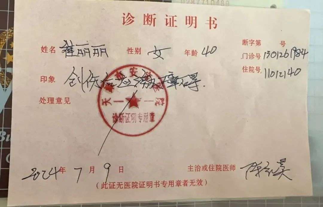 ▲2024年7月9日,经天津市安定医院专家会诊后,崔丽丽被确诊创伤后应激障碍。受访者供图