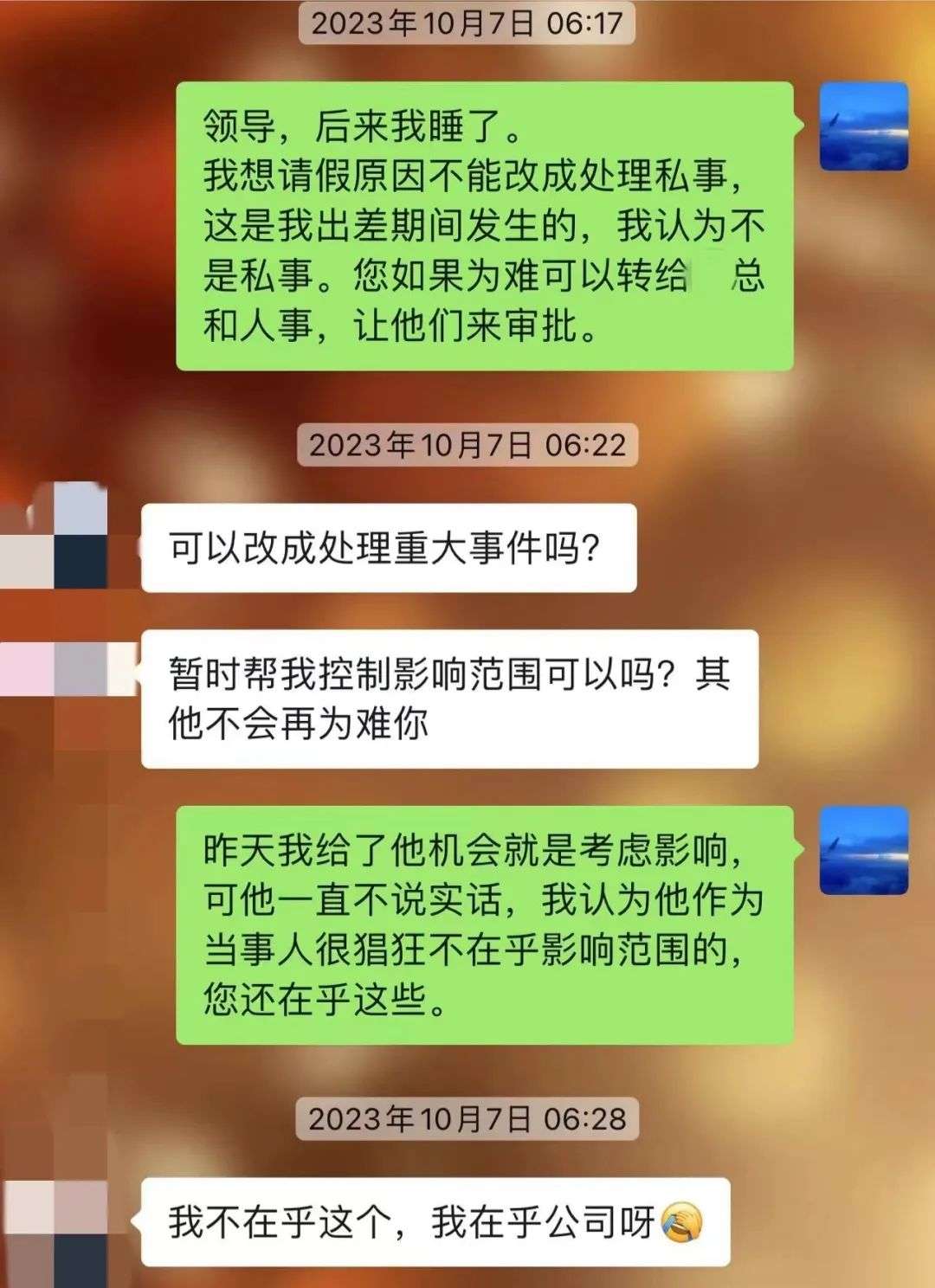 2023年10月6日,崔丽丽曾用OA(数字化办公)系统提交请假,理由是“在因公出差过程中遭受重大侵害”。刘萍回复她,为了不扩大影响,需要把请假的原因修改为“调休,处理私事儿”,刘萍没有同意,之后她便通过微信单独给刘萍提交请假申请。