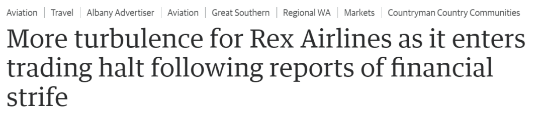 近期,Rex Airlines陷入了困境,它面临着更多动荡,该公司在澳大利亚证券交易所(Australian Securities Exchange)的股票被暂时停牌。
