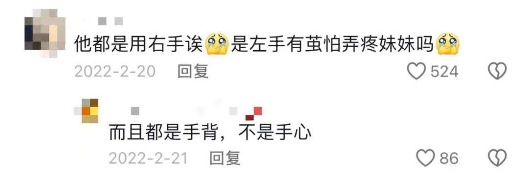 “他用右手哎,是左手有茧怕弄疼妹妹吗?而且都是手背,不是手心。”