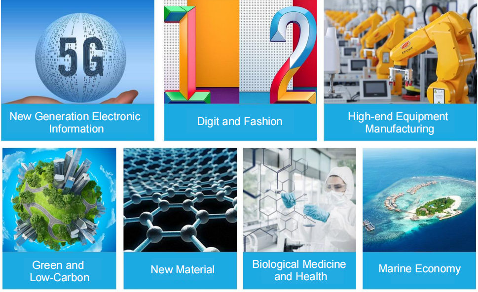 按行业主要有七大类:新一代电子信息、数字与时尚、高端装备制造、绿色低碳、新材料、生物医药与健康、海洋经济。