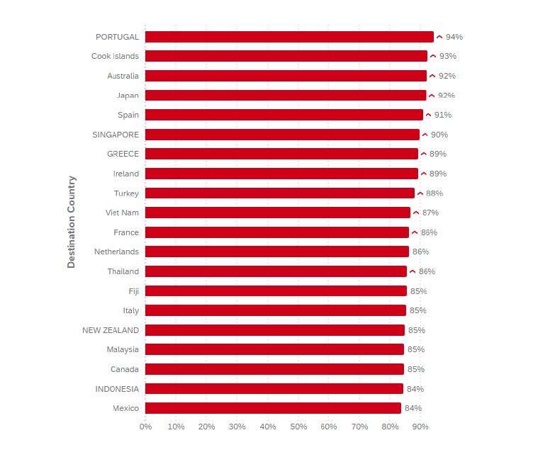 总体而言,澳大利亚以92%的评分排在最受欢迎国家的前三名,仅次于库克群岛(93%)和葡萄牙(94%)。