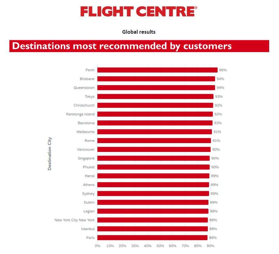 该数据基于过去一年中超过17万名顾客的反馈,比较了旅行社客户推荐其近期旅行目的地为旅游好去处的可能性。