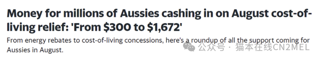 - 250澳元能源账单减免($250 Energy Bill Relief rebate):这是政府去年宣布的500澳元能源账单返还的一部分。从9月开始,符合条件的家庭,包括养老金领取者、老年人和某些Centrelink领取者,将在他们的账单中获得返还。