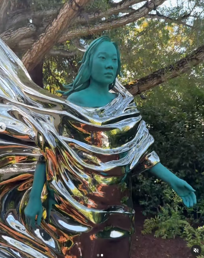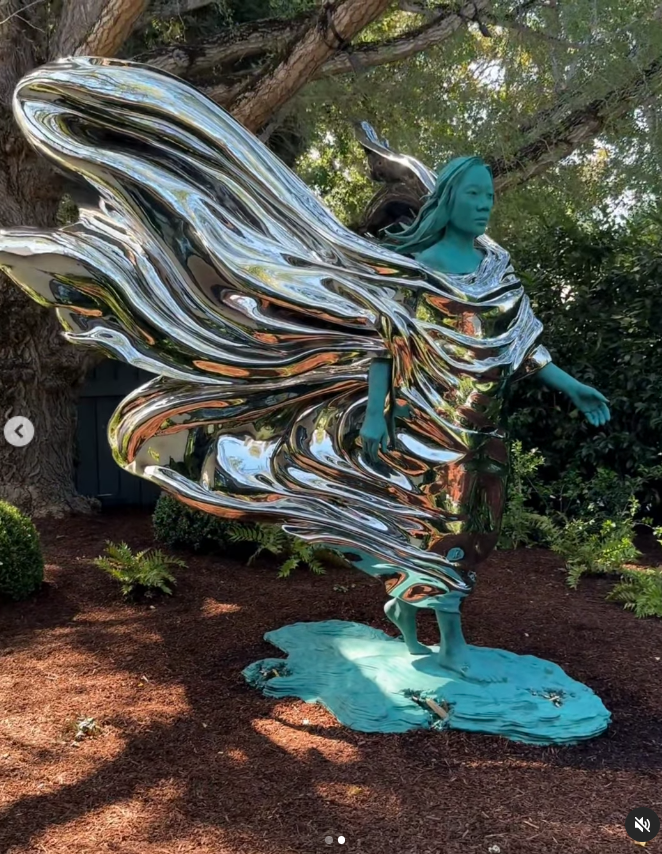 雕塑中的普莉希拉身上披着一件银色的斗篷,飘逸的线条看起来像是天使的翅膀。这座雕塑被安置在一棵树下,看起来是在他们家的私人花园里。