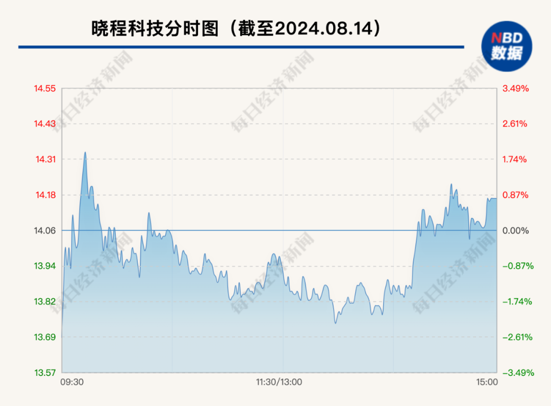 二级市场上,截至8月14日收盘,晓程科技报14.17元/股,公司总市值39亿元。