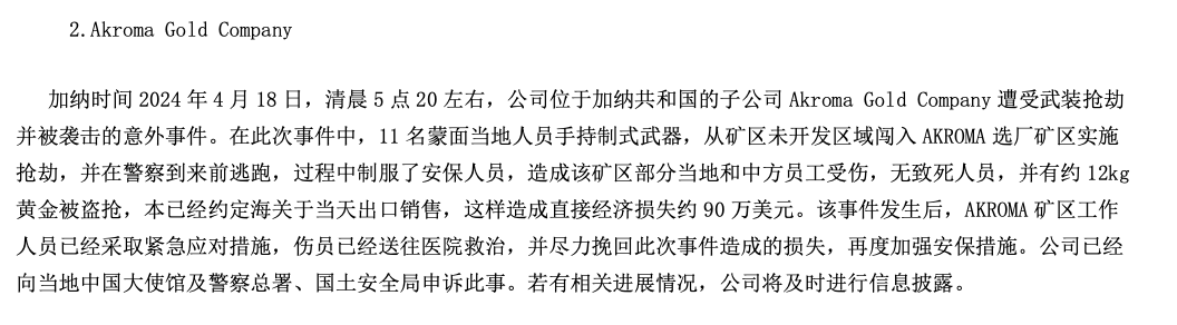 据披露,加纳时间2024年4月18日,晓程科技位于加纳共和国的子公司Akroma Gold Company 遭受武装抢劫并被袭击的事件。