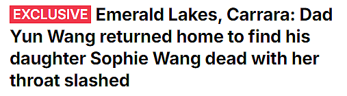 周二晚上6点,王云回到位于Carrara Emerald Lakes的家中时,发现女儿Sophie Wang已经死亡。