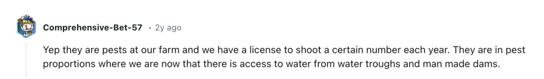 “是的,在我们农场,袋鼠是害虫。我们每年都有许可可以射杀一定数量的袋鼠。因为有了水槽和人工水坝,现在它们的数量多得像害虫一样泛滥。”