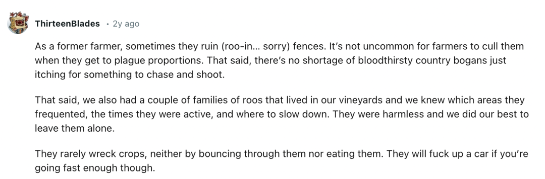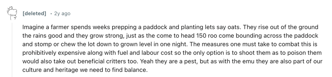 “作为一个前农民,我可以说,有时候袋鼠真的会毁篱笆。当它们的数量多到泛滥成灾时,农民们通常会控制它们的数量。”