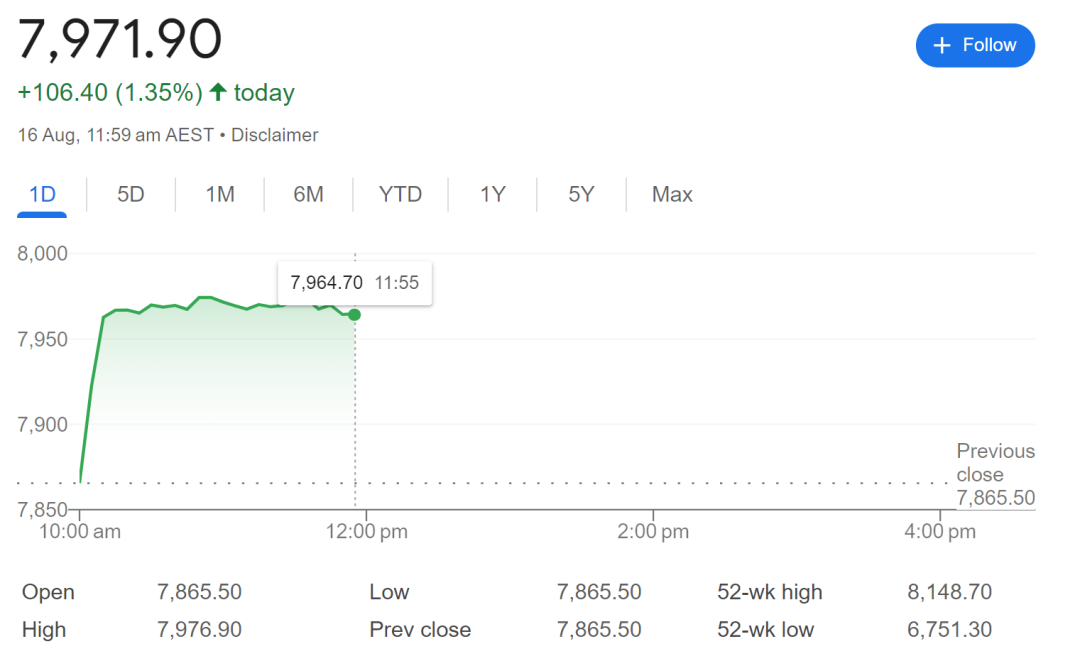 澳股ASX200指数上涨106点,至7972点,涨幅为1.36%。