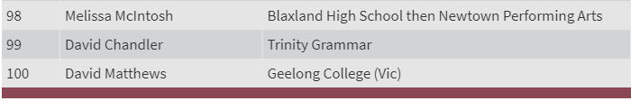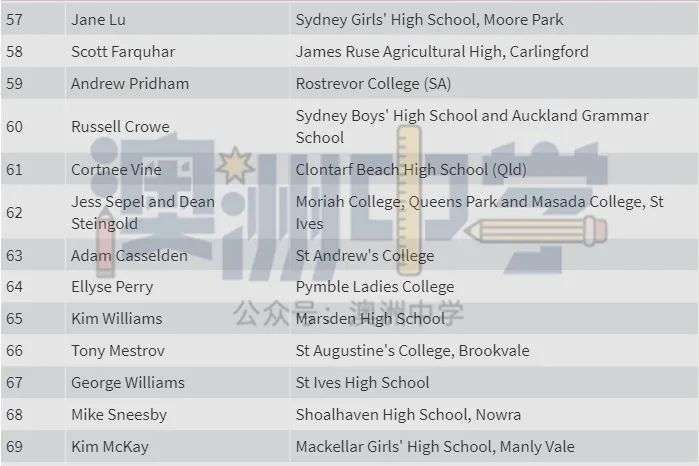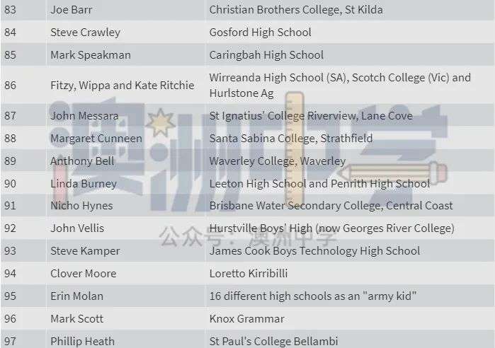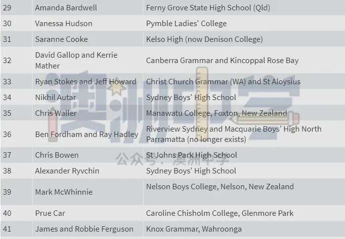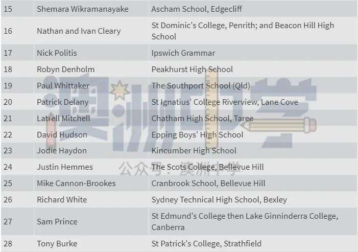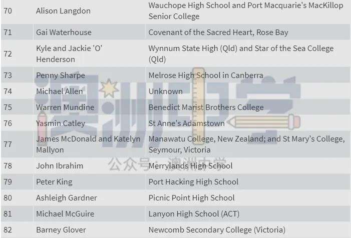 一所是精英公立学校 Sydney Boys High,入选者包括 CBA 老板 Matt Comyn、演员 Russell Crowe 和两位首次入选者 —— 新州年度澳大利亚青年 Nikhil Autar 和澳大利亚犹太人执行委员会首席执行官 Alexander Ryvchin。
