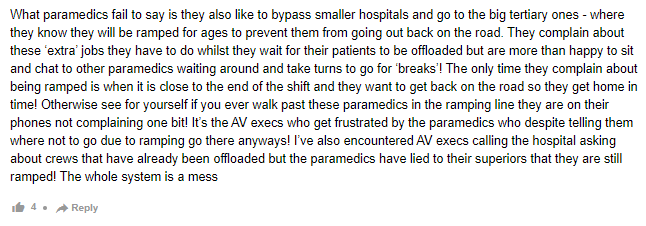 医护人员没有说的是,他们也喜欢绕过小医院,去大型三级医院 -- 他们知道在校医院他们会轮班很长时间,妨碍他们再次上路。他们抱怨在等待病人下车时必须做的这些“额外”工作,但非常乐意坐下来和等待的其他医护人员聊天,轮流“休息”!