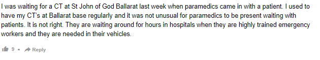 上周,我在 St John of God Ballarat 等待 CT 检查时,护理人员带着一名患者进来了。我以前经常在巴拉瑞特医院做 CT 检查,护理人员陪同患者在场等待并不罕见。这是不对的。他们是训练有素的急救人员,需要他们在救护车里去救人,现在却要在医院里等上几个小时。