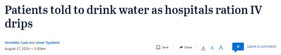 最近,各位维州朋友千万要保重身体,减少生病,不然你连盐水都没得吊,只能靠喝白水来帮助治疗……