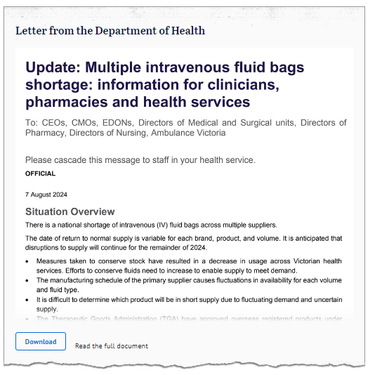 8月7日,维州卫生厅向医院负责人、医护部门领导以及救护车服务机构发出了一份内部文件,明确指出14种静脉注射液产品可能会出现短缺,医院需要更加“省着点用”。