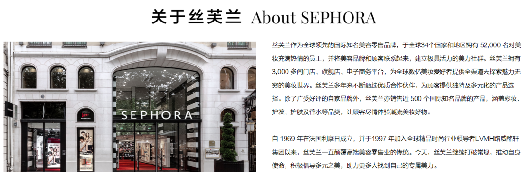 据丝芙兰中国官网,该品牌销售近500个国际知名品牌的产品,涵盖彩妆、护发、护肤及香水等品类,目前在全球34个国家和地区拥有3000多间门店、旗舰店以及电商平台,拥有5.2万名员工。