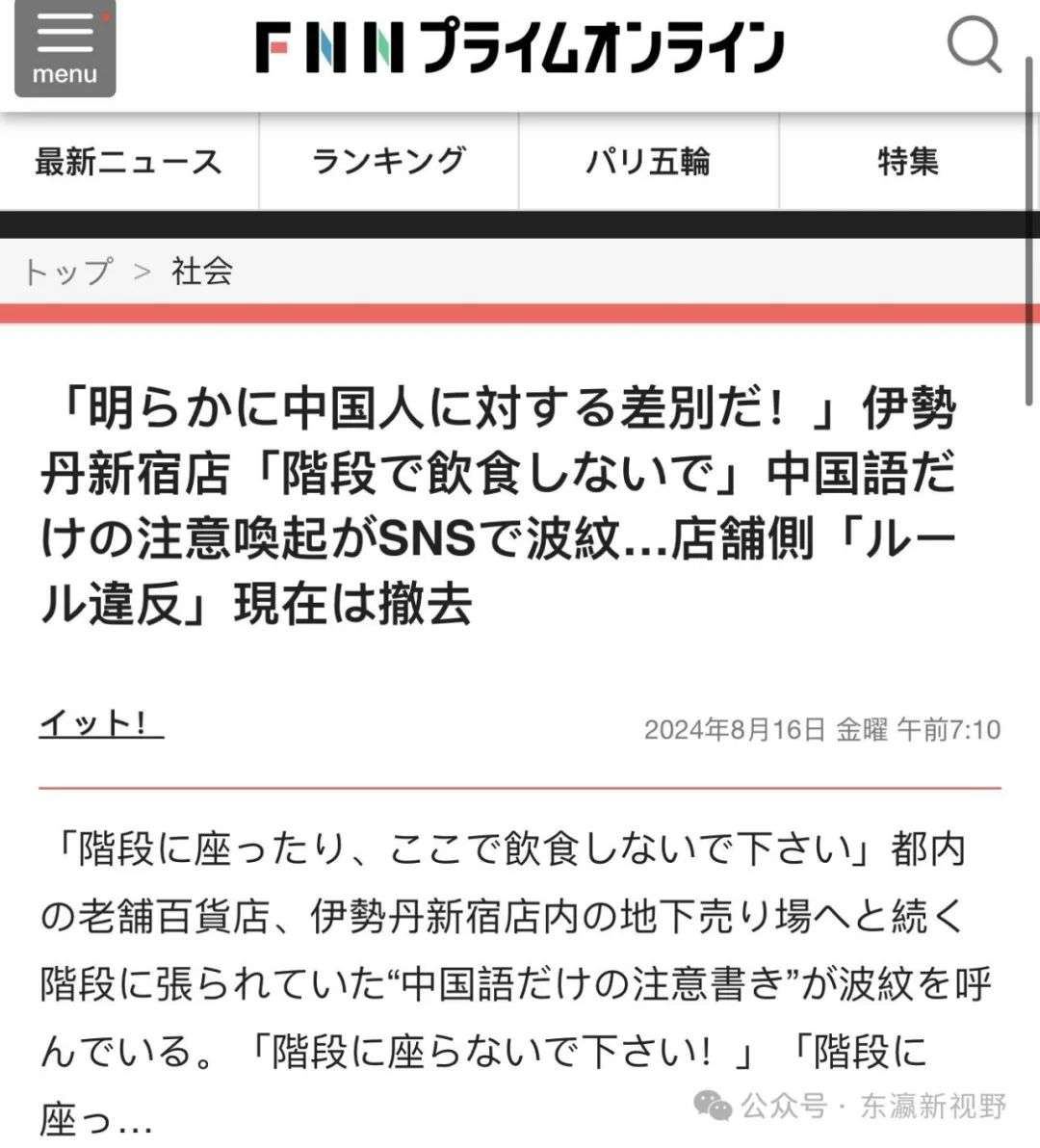 收藏只用中文贴“请勿在楼梯上饮食”警告牌,日本伊势丹百货新宿店歧视性做法引发中国游客和网民不满!