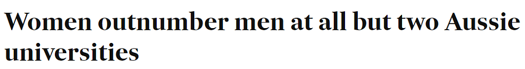 据《澳洲金融评论报》今年上半年报道,在澳洲绝大多数大学中,男生已成为少数群体,仅有两所大学的男生数量超过了女生。随着女性主导的职业领域的增多,以及缺乏非大学教育的选择,女生在大学中的比例已升至60%以上。