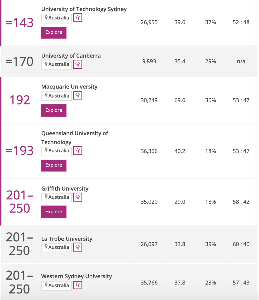 在澳洲,只有新南威尔士大学和墨尔本皇家理工大学(RMIT)的男生人数超过了女生,而麦考瑞大学、悉尼科技大学和卧龙岗大学的男女生比例接近持平。