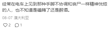也有网友表示,电车上可是重灾区,经常能看到手脚不协调仿佛丧尸一样的人。要么是喝多了,要么是嗑药了。