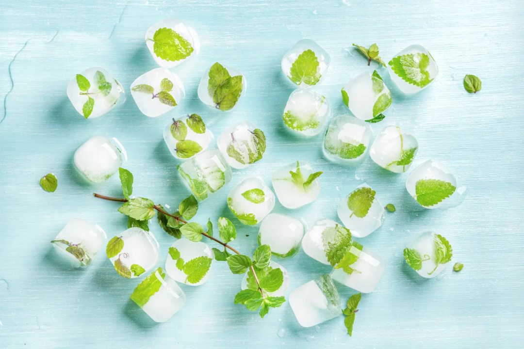 薄荷叶可以冷冻后放入饮料中。