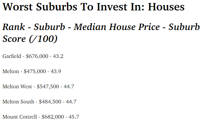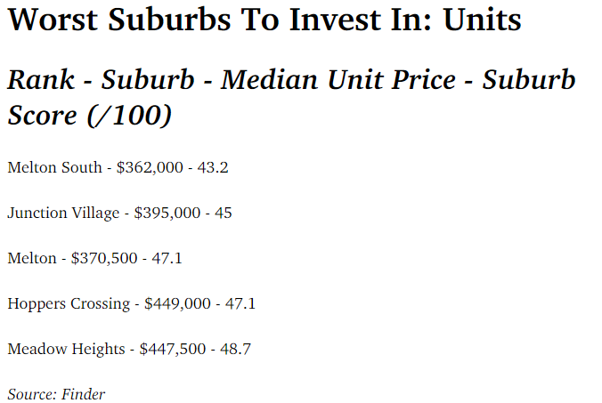 被认为不适合独立屋或公寓投资者的郊区包括西南部的 Carramar 和 Vineyard ,以及中央海岸的偏远地区和悉尼大部分乡村边缘地区。