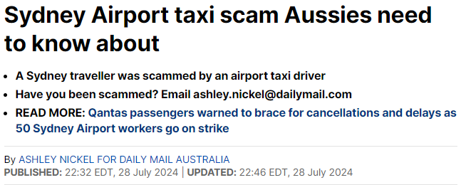 他表示,这已经是自己第四次在悉尼机场打出租车被坑了。