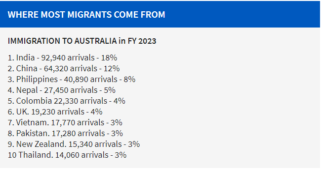 除此之外,尼泊尔(5%)、哥伦比亚(4%)、英国(4%)、越南(3%)、巴基斯坦(3%)、新西兰(3%)和泰国(3%)也位列10大移民来源国。