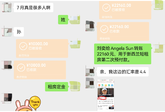 7月11日,Chloe把第二笔租金5000纽币折算成人民币22160元,通过微信付款转给Angela。