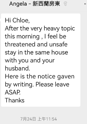 随后,10点多,Angela通过微信,给Chloe发了一条英文信息,表示:“今早谈了这么沉重的话题之后,我觉得跟你和你丈夫住在一起很危险。这是书面通知,请尽快离开。