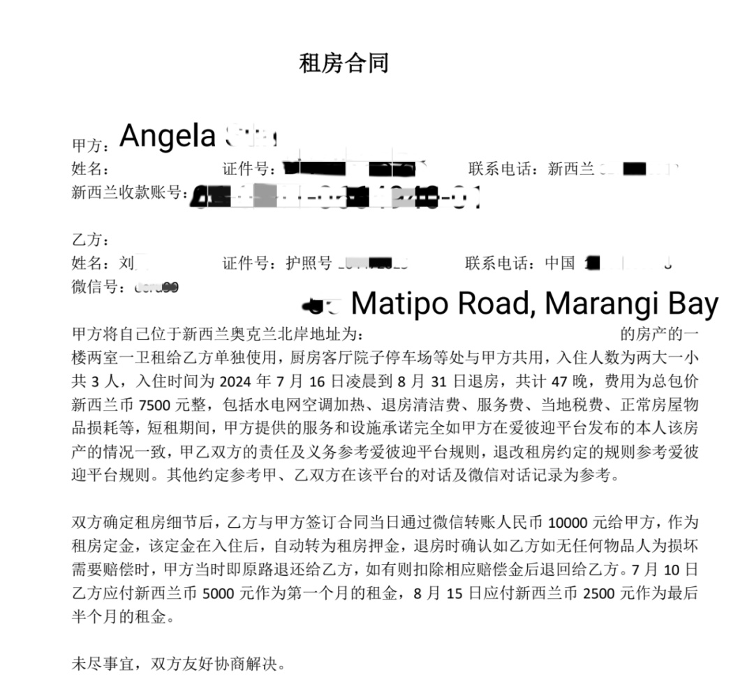 根据租房合同显示,Angela将Matipo Road,Mairangi Bay的房产的一楼两室一厅租给Chloe一家三口单独使用,入住时间为7月有16日凌晨至8月31日退房,共计47晚,总费用为7500纽币。