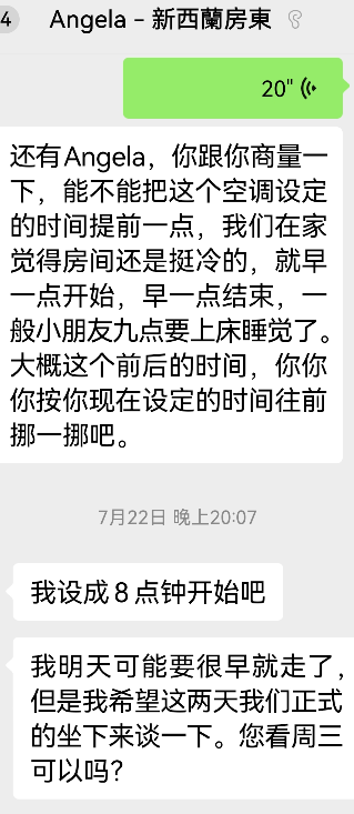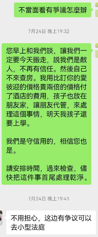 Angela还提到,Chloe一家入住时间太晚,影响了她的作息,尽管合同中已注明他们将在16日凌晨到达。
