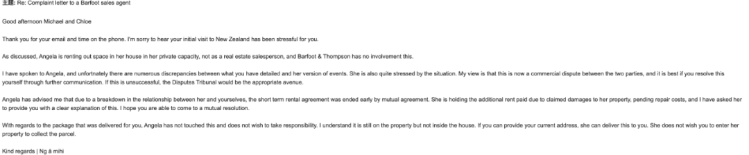 在退款无果的情况下,Chloe夫妇向Angela所在Milford分行经理Henry投诉,但得到的回应是,Angela以私人身份出租房子,与公司无关。