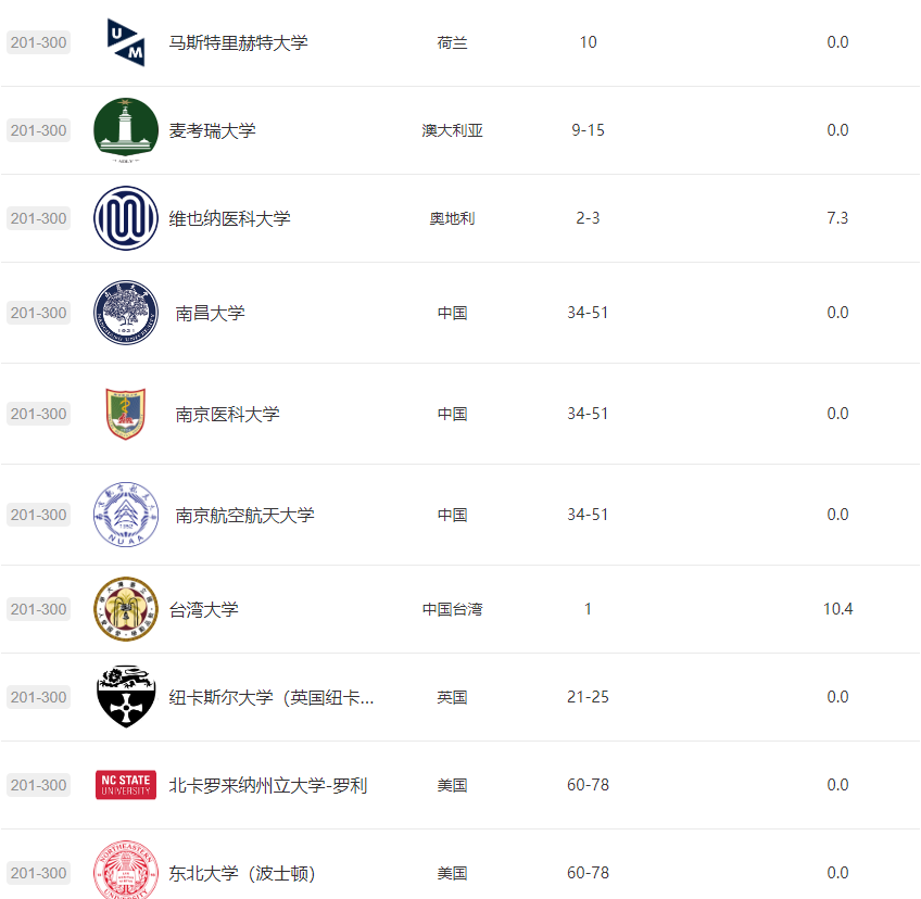 全球最具影响力和权威性的大学排名之一,2024软科世界大学学术排名(简称ARWU)刚刚出炉!排名前300的的学校如下所示: