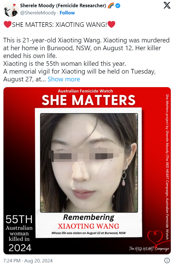 就在8月21日,当地警方刚刚确认了遇害女留学生的身份,她是21岁的悉尼大学中国留学生王晓婷(Xiaoting Wang,音译)。