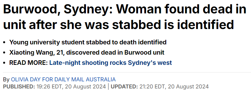 据Daily Mail报道,8月12日早上8点45分左右,王的尸体在悉尼Burwood Conder Street的一栋高层公寓楼内被发现,身上有多处刀伤。
