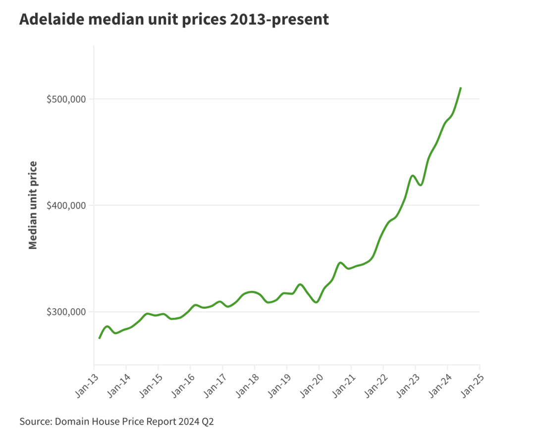 6月份季度Domain房价报告显示,南澳首府城市的单元房平均价格在过去三个月内上涨了5%,在一年内上涨了15%,达到创纪录的511,039澳元新高。
