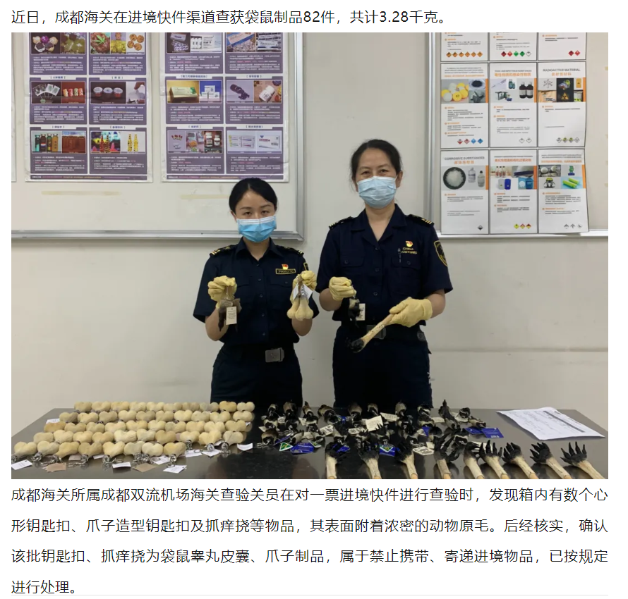 其实,在去年,海关总署官方信息平台海关发布的公众号上就曾提到过,广州海关在进境寄递渠道查获一批动物制品,经核实为袋鼠睾丸工艺品,当时就按规定作进一步处理了。