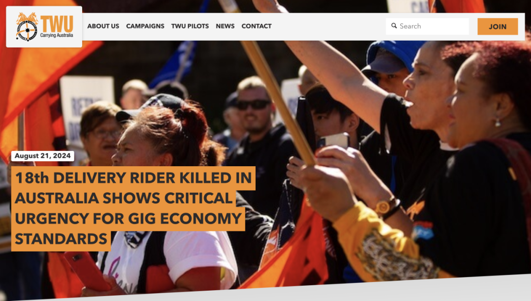 澳洲运输工会全国秘书长 Michael Kaine 表示,这起悲剧事件凸显了零工需要安全和公平的工作条件。
