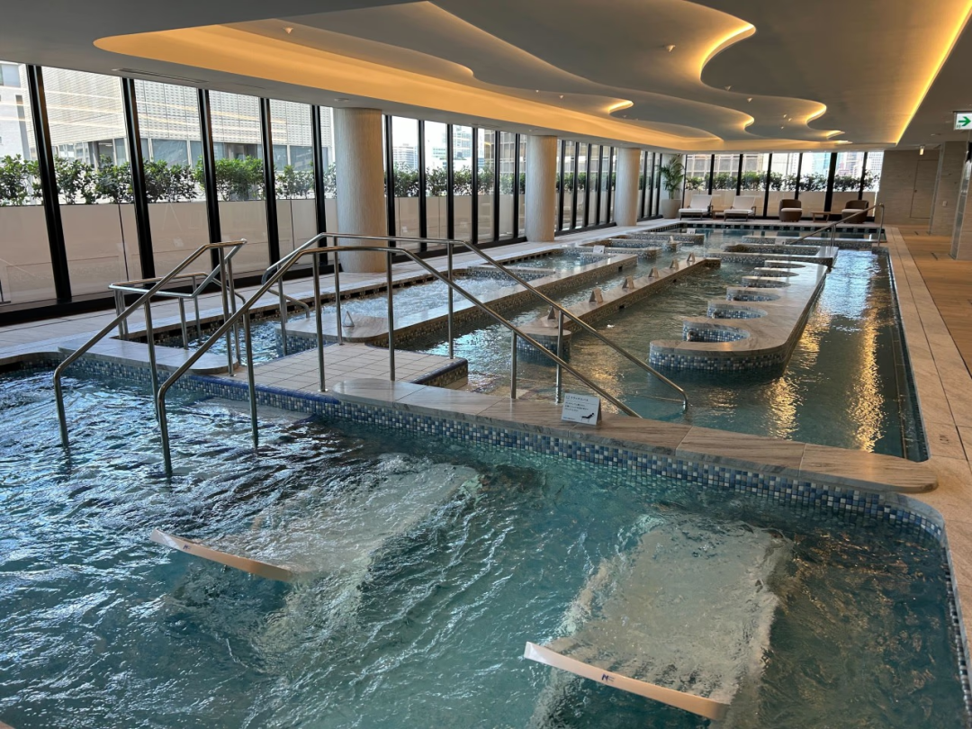 楼上的保健区,包括一个设计非常独特的恒温游泳池,方便年长住户在泳池中锻炼、漫步和进行水力按摩;旁边还有大浴场、桑拿浴室,健身房和举办锻炼项目的场馆;