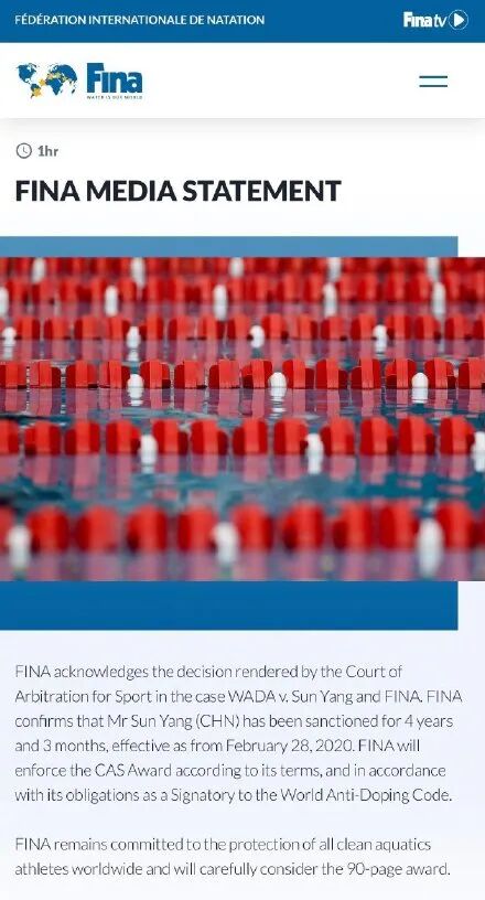 2021年6月22日,国际体育仲裁法庭宣布了对“世界反兴奋剂机构诉孙杨和国际泳联案”的重审结果: