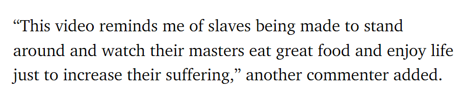 另一位网友说:"这段视频让我想起奴隶们被强迫站在旁边,看着主人们享用美味的食物,享受美好的生活,只是为了增加他们的痛苦。"
