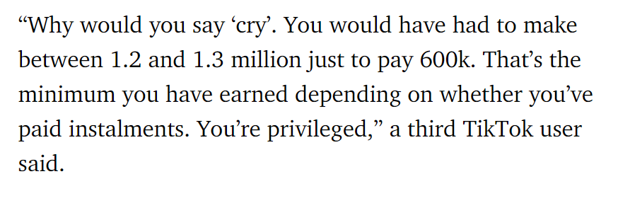 还有一位网友说:"你有什么好哭的呢?60万的税款意味着你的收入至少达到120万到130万澳元。这还是你最低的收入,取决于你是否用了分期付款。你得了便宜还卖乖。"