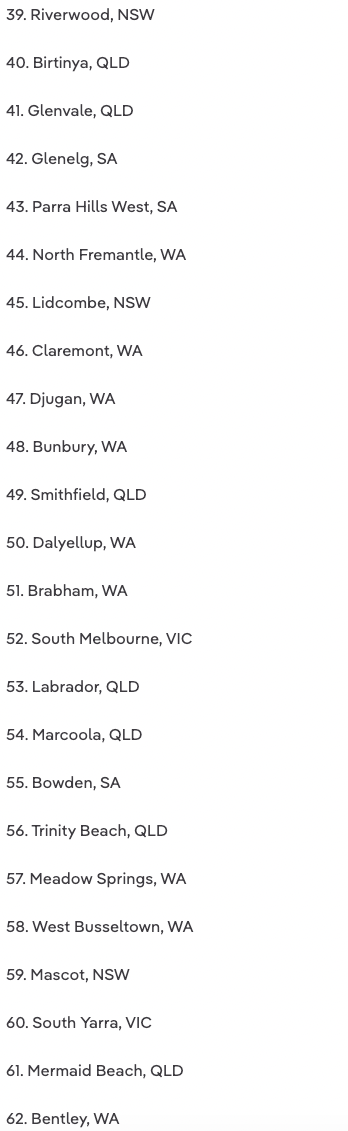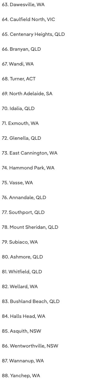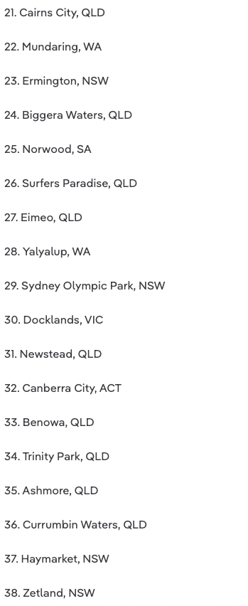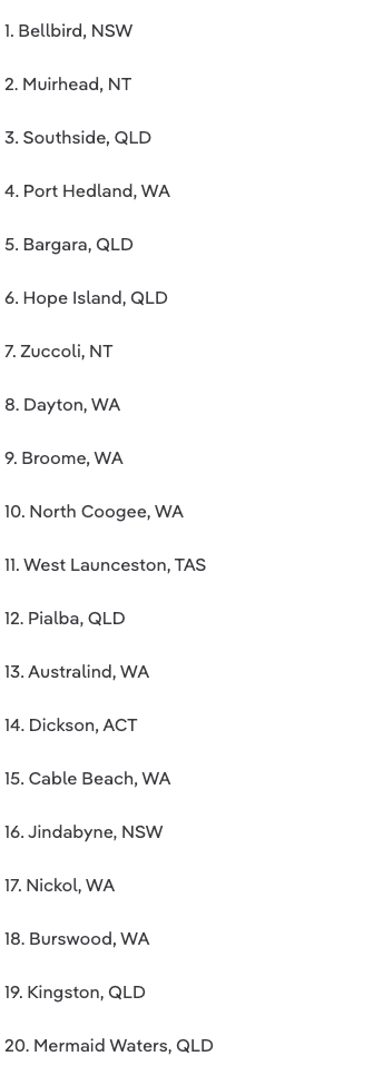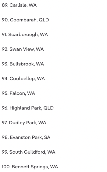 珀斯在名单上占据最多的区,有27个,其次是黄金海岸有13个,悉尼有11个,凯恩斯有7个,阿德莱德有6个,墨尔本有4个,堪培拉有3个。