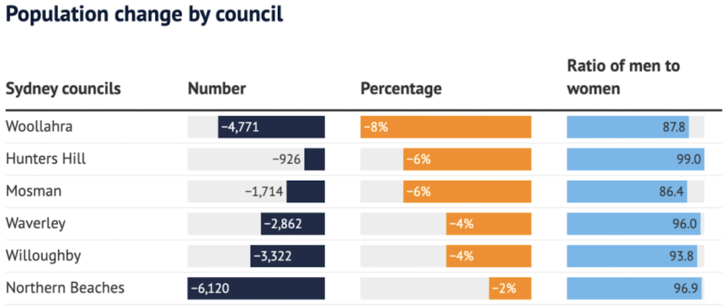 在悉尼,包括Mosman、North Sydney等在内的市议会失去了数千名居民。仅Northern Beaches就减少了6120名居民,约占其总人口的2%,而Woollahra减少了8%。