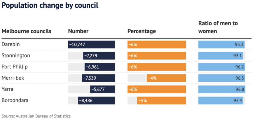 除了这些市议会区域失去居民外,它们也越来越多地由女性主导。Woollahra和Mosman的男女比例为87比100,而在墨尔本,Stonnington和Boroondara的男女比例则是92比100。