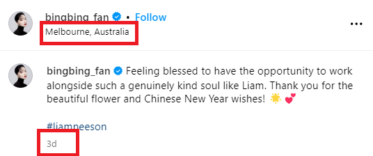 尽管之前有报道称范冰冰拍摄完毕后已经离开了澳大利亚,但近日,她在自己的Instagram上晒出了几张照片,地点标注仍然是墨尔本。