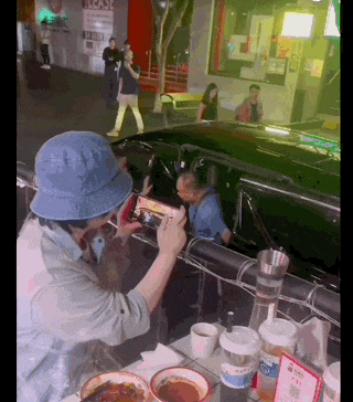 视频中,她拿着一碗北京炸酱面,在街头蹲着吃。